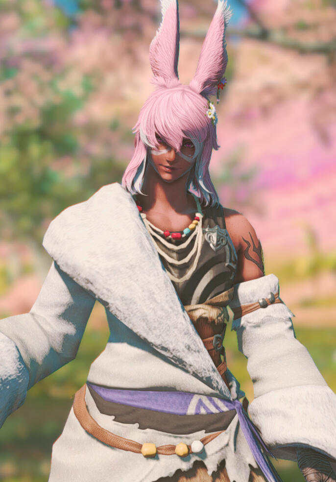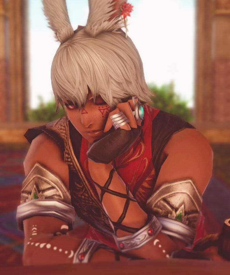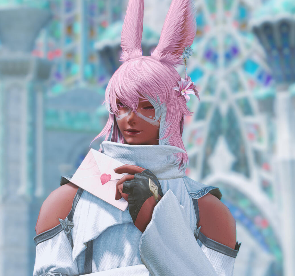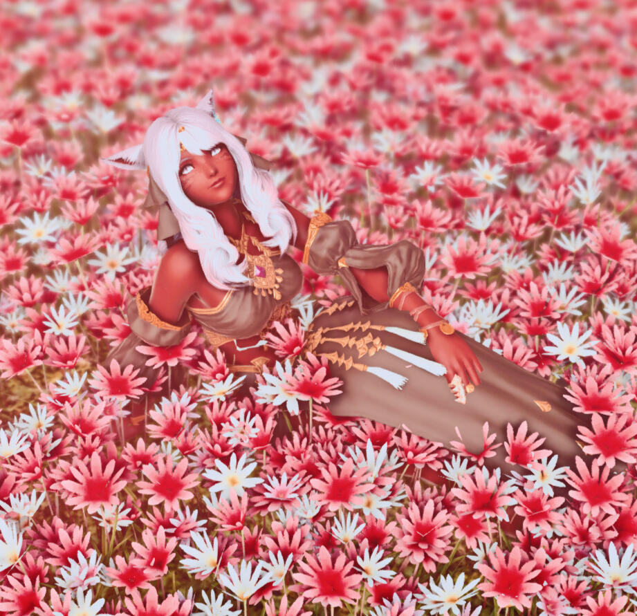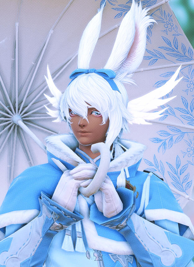 Liezel hails from Dalmasca, raised by the Rava viera of a different tribe as well as the Moogles, after his parents left him to fend for himself deep within the woods of Golmore Jungle. They were unable to care for his strange illness that involved fevers, hallucinations, and unusually enough, coughing up flower petals, and left him for the wolves. The Moogles knew immediately that the bun had developed something known as Hanahaki Disease and took him in, doing do all they could to alleviate his symptoms. He grew close to his newfound companions, and this illness of his seemed to be improving bit by bit, until an invasion by the Garlean Empire warranted his escape, severing him from family.Stranded and heartbroken, Liezel's condition worsened, and she found herself in a struggle to stifle the flowers in her chest from blooming. It is not without the sincere, gentle care and kindness of Mother Miounne in Gridania that Liezel's blooms calmed down once more.Far from home, limited knowledge of her illness, and without the care of the Moogles, the future felt terrifying. Yet, Liezel found the resolve to venture out into the world to learn as much as she can of her disease, and to figure out how to cure it, if any method exists at all.One day, on an errand for the proprietress, Liezel runs into Yda and Papalymo, and it is though their chance encounter does the bun get swept into a storm as the budding Warrior of Light.